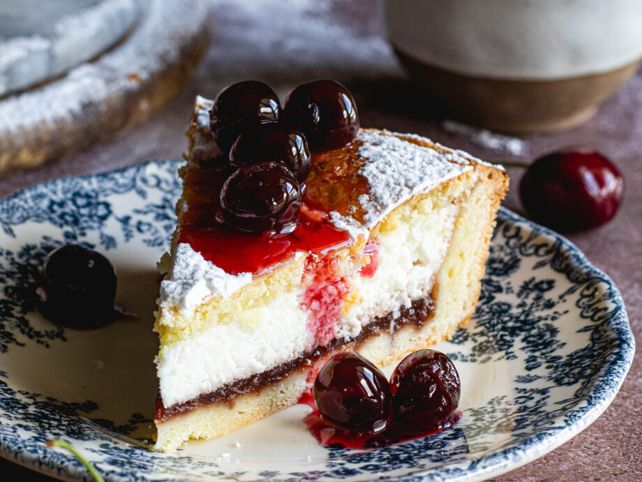 Servi la fetta con sopra un cucchiaio di amarene sciroppate.